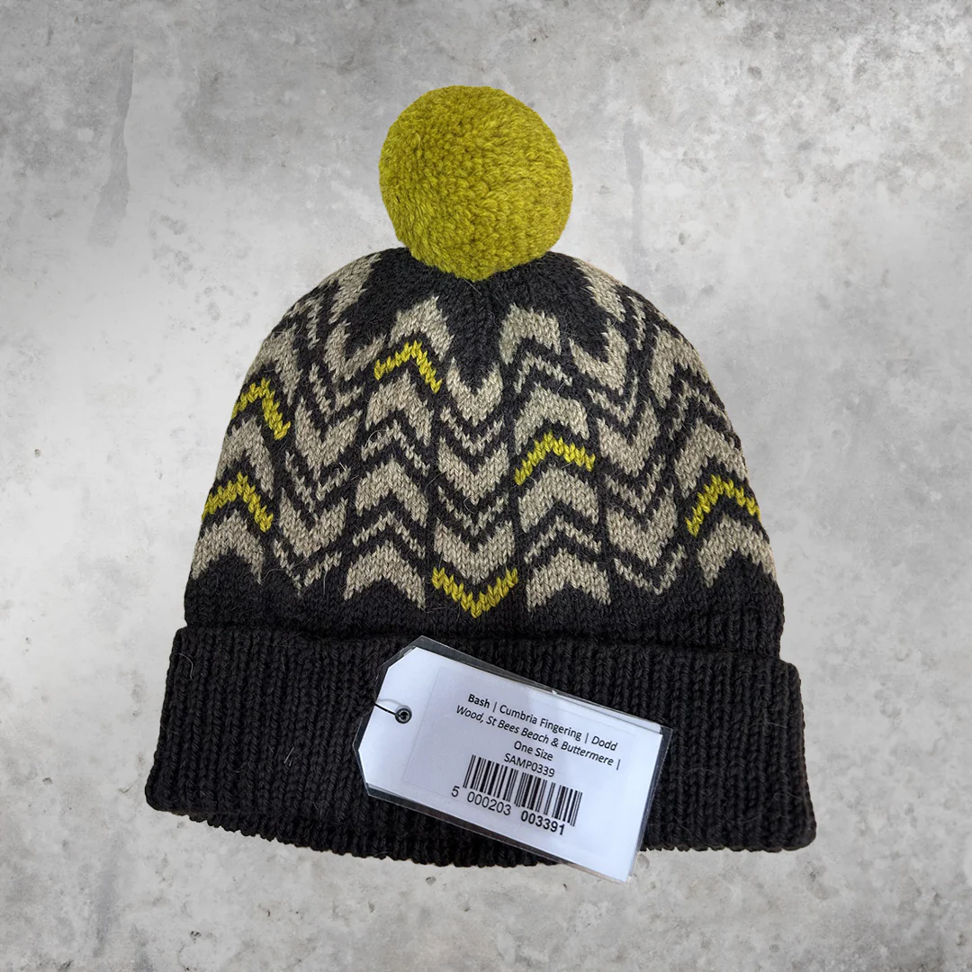 Designed by Linda Dubec for Pom Pom Quarterly Issue 21, the Bash hat is a bold yet wearable colorwork accessory inspired by graphic arrow motifs, brought to life with a playful pop of contrast color echoed in the pom pom and selective duplicate stitch details. A classic ribbed brim ensures a snug, comfortable fit, making this hat easy to wear for everyday cold-weather outings while still feeling special and design-forward. Knit in The Fibre Co.’s Cumbria Fingering, the pattern takes full advantage of the yarn’s smooth hand and crisp stitch definition, which beautifully showcases the clean lines of the colorwork. The yarn’s blend of Merino wool and Masham adds warmth, durability, and just enough structure, resulting in a lightweight but cozy hat that’s perfect for layering and long-term wear.
