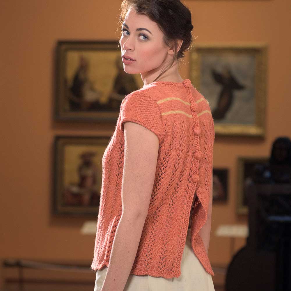 This back buttoned top is knit from the bottom up starting with a pretty fern lace stitch that makes a light and beautifully handled fabric. The lace stitch ends just at the chest where a second color is added for a feature stripe sequence. Capped sleeves add a feminine touch and the open back features large fabric covered buttons.