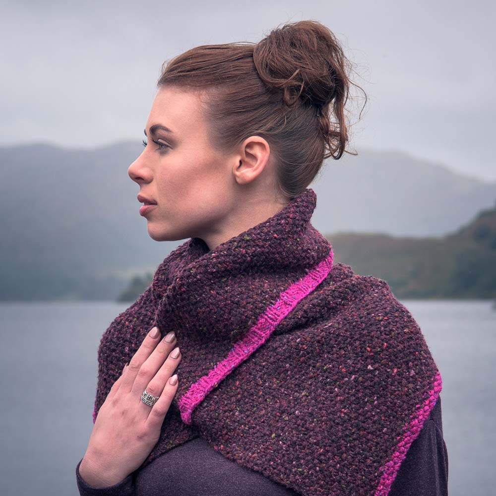 This simple capelet begins with a rib in the contrasting color and then changes to the main color with increases, creating a seed stitch rectangle, and ends with a moss stitch edging in the contrasting color.