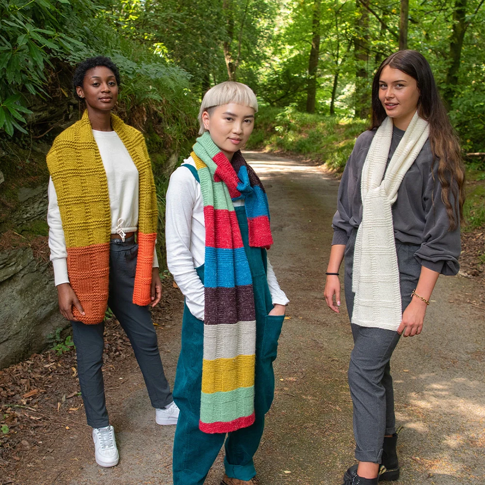 The Gridland Scarf is knit from one end to the other, using knit and purl stitches to create a gridded pattern in the fabric. A slipped-stitch selvedge keeps the edges tidy. Weave in the ends, block your scarf, and voila! Your first scarf is ready to wear!
