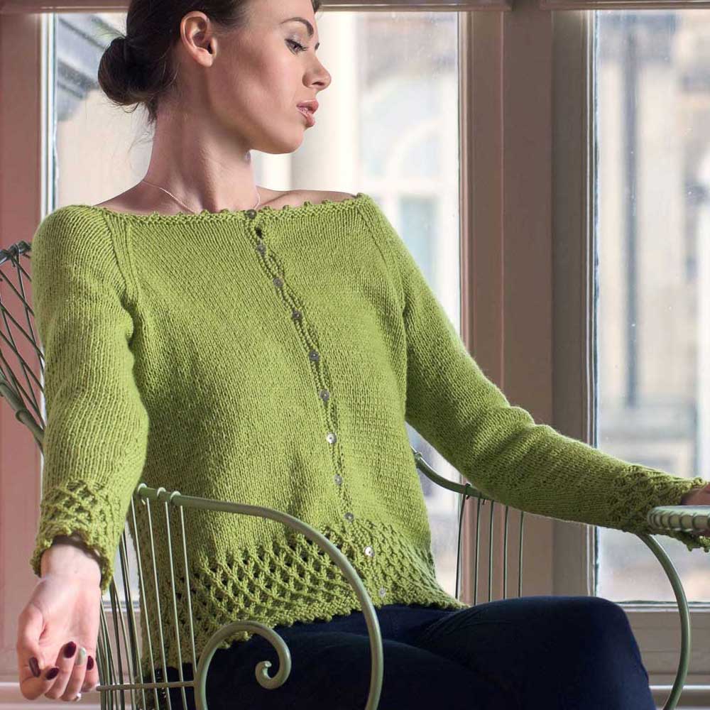 A feature lace design sits on the back panel of this raglan cardigan. The neckline and cuff has a pretty scallop edge with a simple garter stitch at the hem. Both the fronts and sleeve begin with approximately 8 cm (3 in) of the lace stitch and then transition into stocking stitch. The button band is finished with a mid-grey shell button.