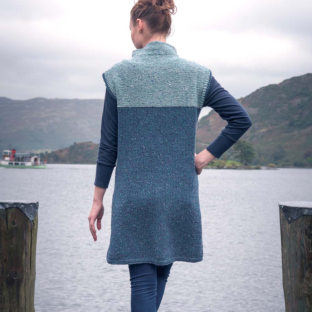 This easy-to-wear tunic is knit in pieces with a side seam opening and armhole edges in garter stitch and a lovely contrasting lattice stitch yoke. After joining the shoulder seams, stitches are picked up along the neck edge to work the funnel collar.