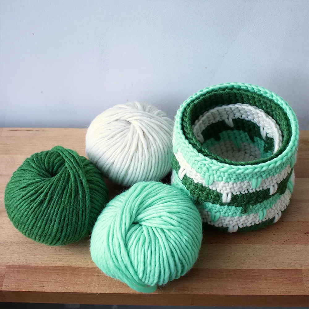 The Nestie Basket Bunch come as a trio of three perfect sizes: small, medium and large. A spike stitch across the rounds gives color contrast and texture detail. Choose the color combination that matches your home and enjoy making this easy crochet project that gives you stunning results. With so many more of us working from home, at least for part of the week, our thoughts turn to how to make our environments reflect our own personal style and how to make them more cozy. What could be nicer than practical yet stylish Nestie Baskets in your favorite colors?