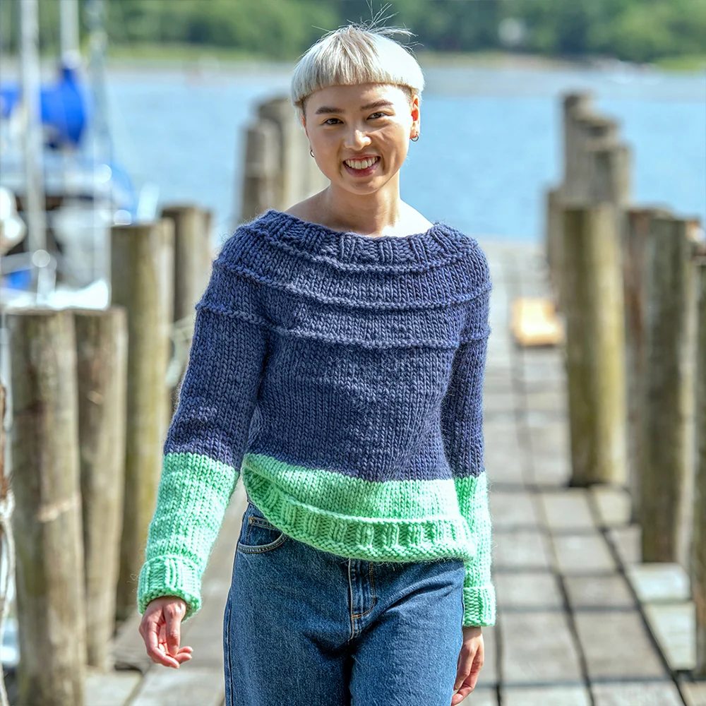 This pattern is available in two kits, Purls of Wisdom Sweater (solid) or Purls of Wisdom Sweater (colorblock). Both kits include &Make Super Bulky and the PDF pattern.